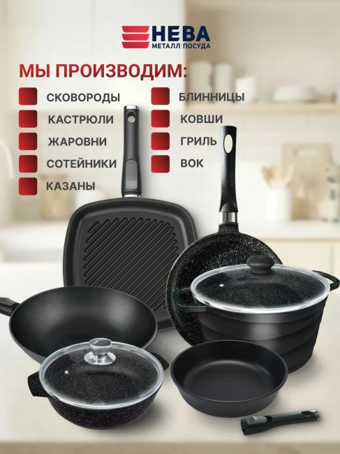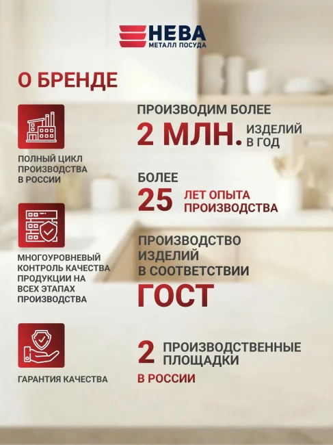 Производитель: АО "Нева металл посуда", Россия, г. Санкт-Петербург, пр. Маршала Блюхера, д.78, лит. Н, пом. 77, горячая линия (гарантия) 8-800-222-80-32