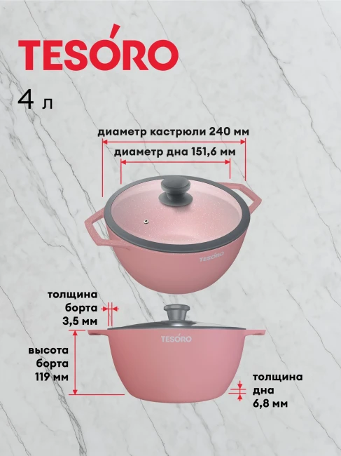 •Кастрюля Tesóro - прочный корпус из литого алюминия. Кастрюля не деформируется, равномерно нагревается и долго сохраняет тепло. Легче чугунной и намного прочнее кастрюли из штампованного алюминия.